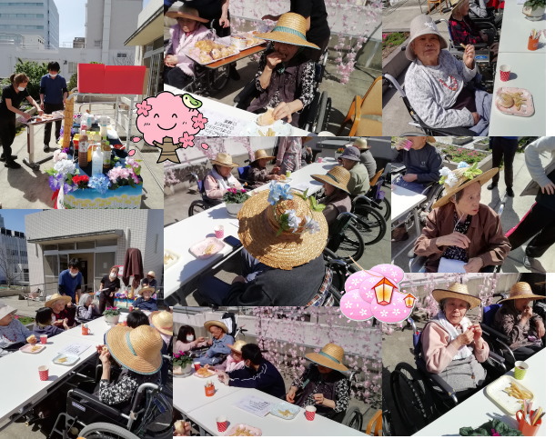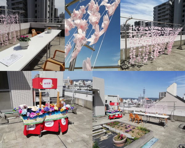 会場に入居者様を招待し、屋上お花見レク開始!